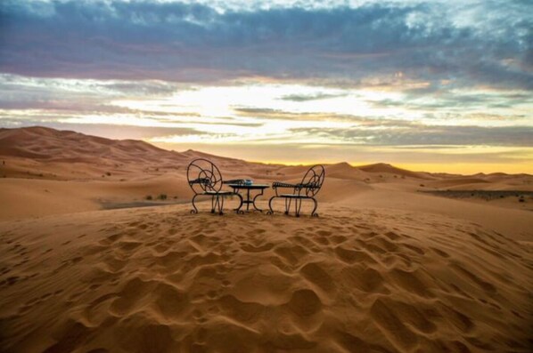 Enjoy the once in a lifetime experience of sleeping in a berber tent under the desert sky. Beautiful authentic decorations combined with all the comfort modern amenities can offer will make your stay more than worthwhile. Discover the pure beauty of the Sahara in a swoon worthy setting, surrounded by sand dunes and the Milky Way. All our tents offer plush beds, private bathrooms and original berber furniture. Wander around the camp for breathtaking sunsets that will reconnect you