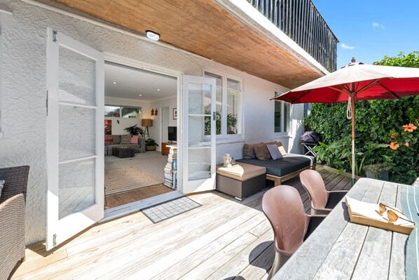 Open up the side door and create that all important indoor-outdoor flow out onto the patio. Enjoy a cuppa at the coffee table, take a nap on the shaded daybed, or fire up the BBQ and get grilling for an alfresco feast at the outdoor dining table, complete with a sun umbrella.