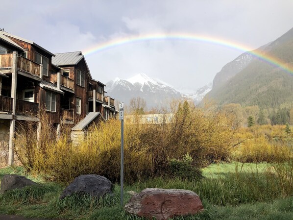 Open the sliding door to the deck or peer out the living room or master bedroom windows and view wetlands, pond sanctuary with beavers, ducks, geese, hummingbirds literally bring the mountain views to life. Views of Ajax Peak and Ingram Falls. Enjoy the views and summer festivals in town park from the deck.