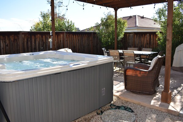 Grande vasca idromassaggio per 8 persone recentemente installata sulla proprietà. Gli ospiti che desiderano utilizzare questa necessità devono richiedere e pagare una tassa di pulizia una tantum di $ 50.
