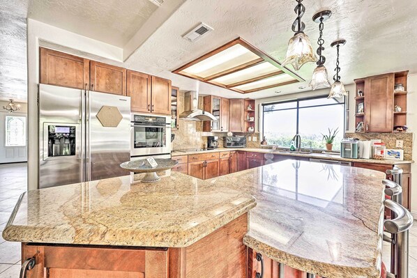 KITCHEN: Cooking basics, breakfast bar w/ seating, stainless steel appliances, spices, dishware & flatware, drip coffee maker