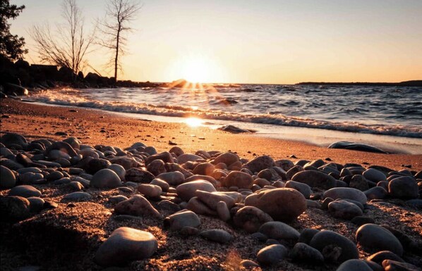 Our local deeded access beach, (semi-private and shared with local homeowners) is less than a five (5) minute walk away. The beach is on Georgian Bay, with crystal clear waters and amazing sunsets. Water shoes are recommended as the beaches in this region can be rocky. See pictures.