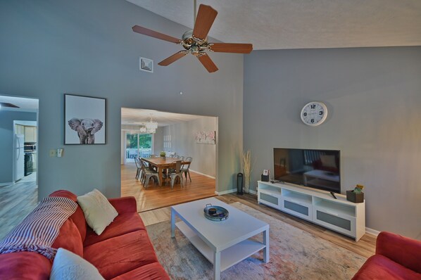 Our 5-bedroom, 2.5-bathroom home features 4 queen beds, 2 double beds, and 2 single beds. Watch movies and shows on 2 large Roku Smart TVs for a theater-like feel. Sip drinks at the bar as you watch your family and friends play board games or pool. And as the weather cools down, warm up by the fireplace. (Firewood not provided).