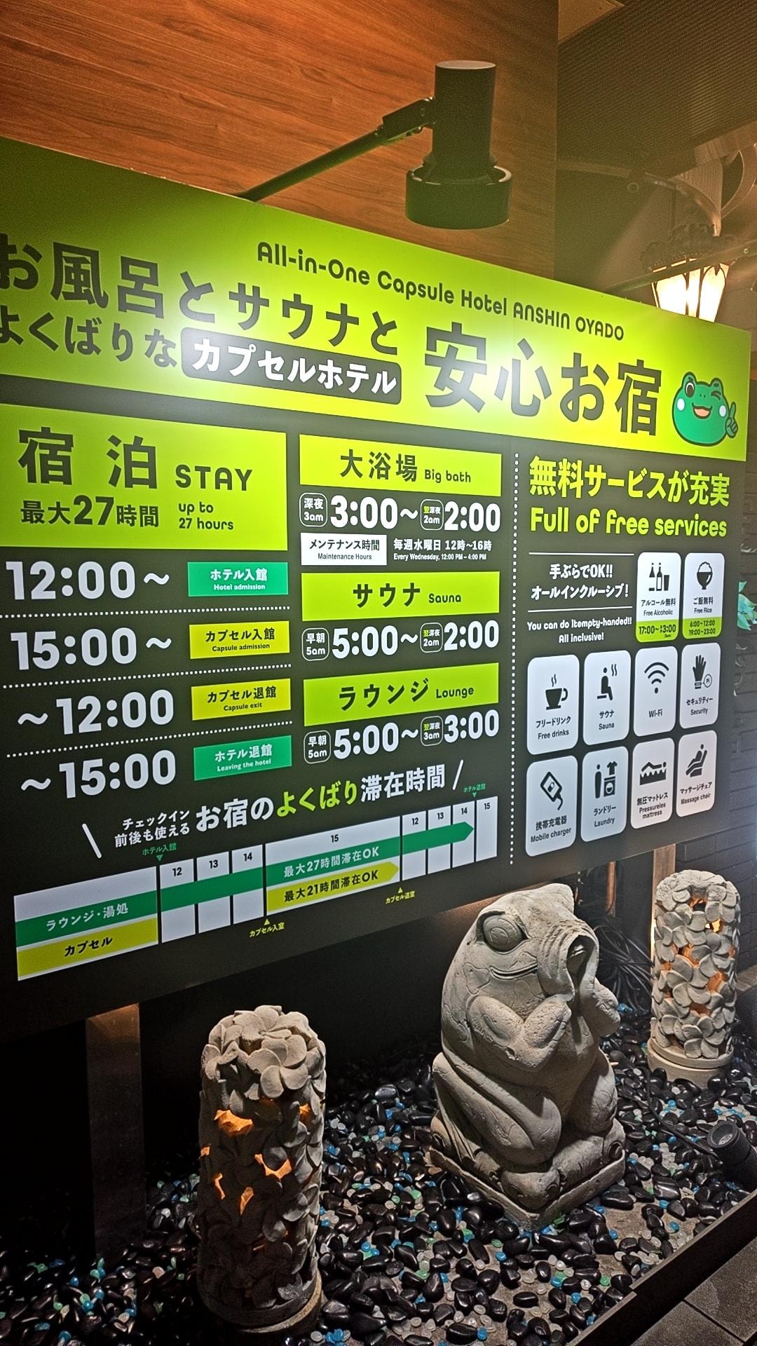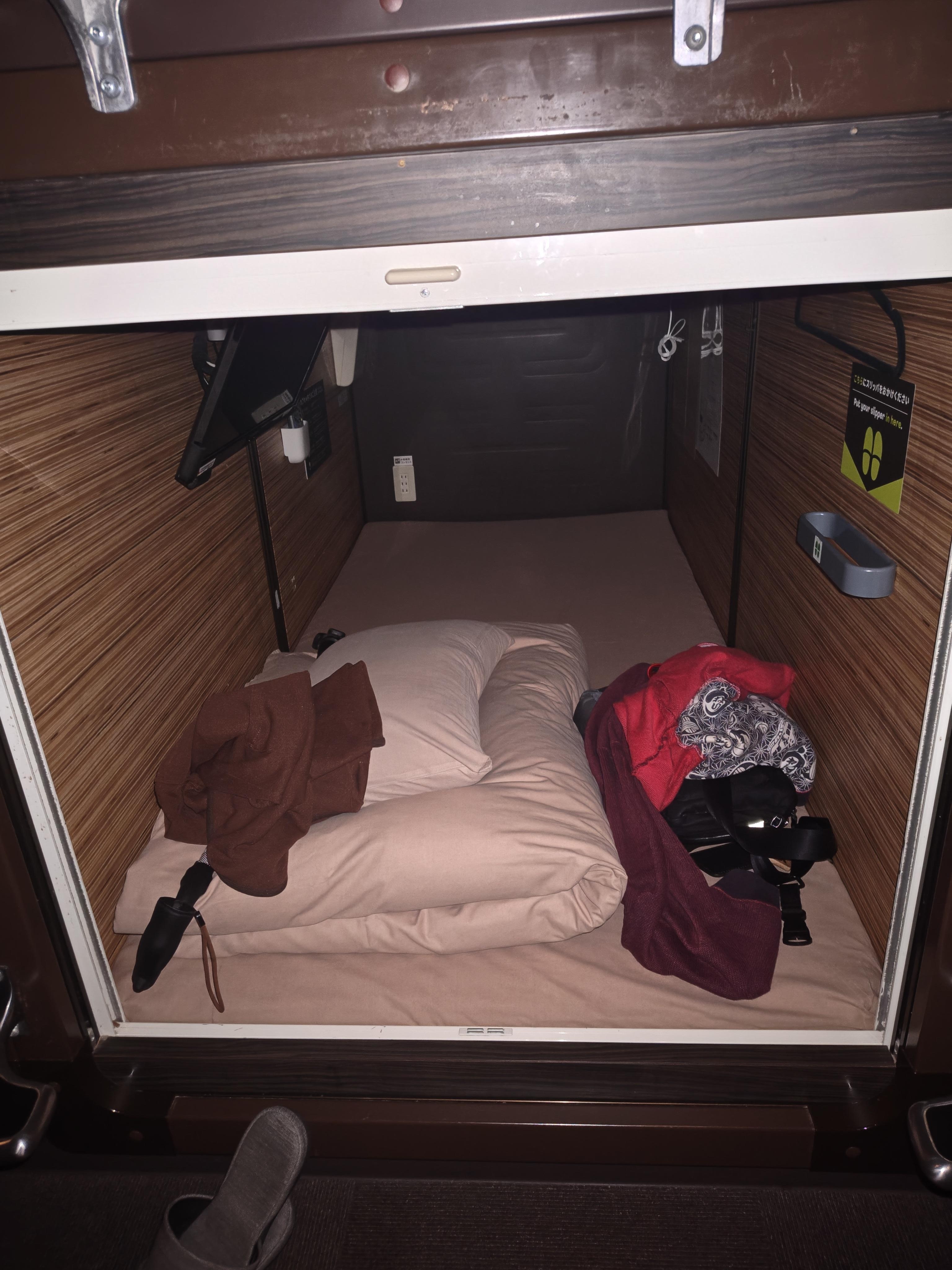 I had an amazing time at this hotel, beyond all the amenities. The environment was great. Had no problems. Staff spoke English well and was kind. Wifi worked great. The free meal options were money savers. It was a pleasure staying here solo. Would definitely stay here again whenever I come back to Japan solo! I did get the bigger capsule they doesn't have a tv. But it was roomie. And comfortable. Can't say enough good things about this capsule hotel! Arigatou!