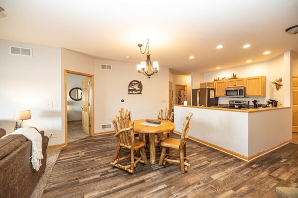 INDOOR LIVING: ‘Up North’ deer/moose themed décor, dining table, ceiling fans, 3 Smart TVs, lower-level bar w/stools and full-sized refrigerator