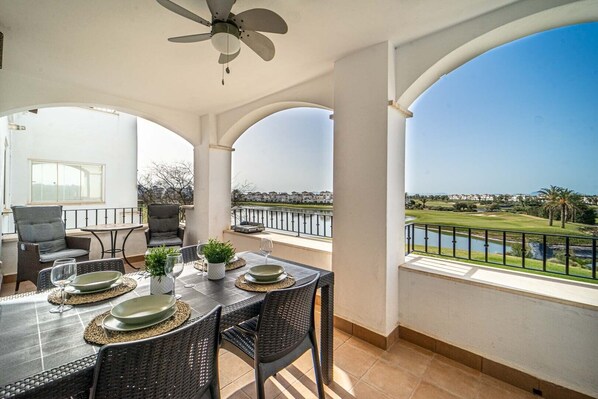 L'appartamento vanta una terrazza privata coperta. A vostra disposizione anche un'area esterna condivisa, composta da una piscina, una piscina per bambini e un campo da tennis.