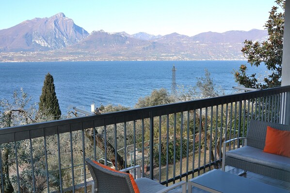 Dalla cucina e dal soggiorno è possibile accedere all'ampio balcone, completo di tavolo da pranzo e salottino esterno con vista sul lago.