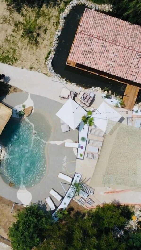 Una piscina stagionale all'aperto con lettini e ombrelloni da piscina