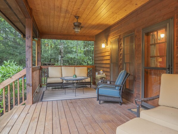 I wish we could have stayed longer. This is a great location for access to the Townsend side of the park. The cabin is tucked away in the woods, so don't expect a view from the porch, but it's a great porch anyway. The cabin was very clean and well appointed - more useful kitchen stuff than we have at home. The fireplace would be great in cooler weather. We will certainly consider staying here again.