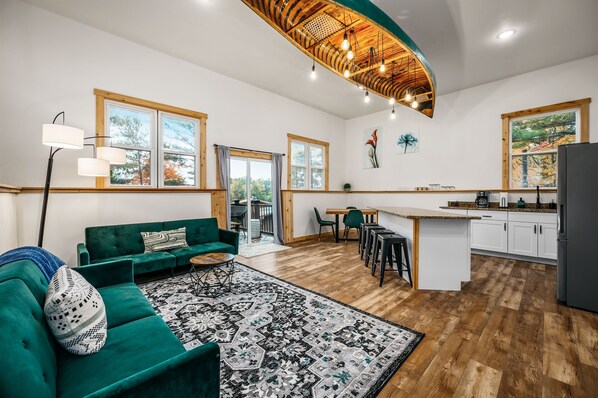 This modern rustic escape has a style all its own. An antique canoe hangs from the 12ft ceiling providing the lighting for memorable nights with friends and family. Days are spent on beautiful Spider Lake just a short walk down the hill to our shared resort beach frontage. Make sure to inquire about availability for pontoon and paddleboard rentals! This space has 2 bedrooms w/queen beds. Each of the 2 baths have large tiled showers. This is part of a lakeside resort where other guests will share the beach and exterior amenities. There are endless activities and attractions located nearby. Downtown Traverse city is the home to many shops and restaurants, Turtle Creek Casino, and Leelanau Peninsula with it's many wineries. There is something for the outdoor enthusiasts too: Biking or hiking the Tart Trail, skiing or snowboarding at Mt. Holiday, Cross-country skiing or walking the 3k to 25k loop at Vasa Pathway, or enjoying the beach at East Bay Park or Clinch Park. There is no need to leave the resort to find something fun to do with our pontoon and SUP rentals. There is also snowmobiling or snowshoeing across Spider Lake. Keystone Soccer Complex and Flint Field's Horse Park are just a quick drive away.