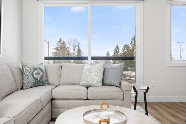 The spacious living room features a large cozy Ethan Allen sectional that duals as a pullout sofa and has a large smart TV. This condos modern and luxurious feel makes it the perfect place to gather after a long day of exploring!