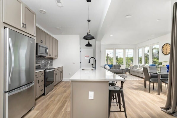 The stylish main bedroom holds a comfortable king size bed with a flat-screen TV, walk-in closet and has an ensuite bathroom! The charming guest bedroom holds a king size bed, closet, and a flat-screen.There is a drip coffee maker in the kitchen and we do provide a couple of single serve coffee bags to start your stay on the right foot.