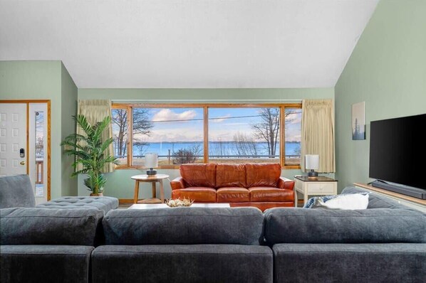 Back inside, into the living room you have panoramic views of West Grand Traverse Bay, ample seating, a smart TV, & games! Plenty of seating with our sectional & leather couch.