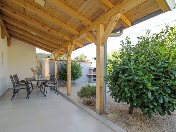 Metà di una villetta bifamiliare 4 locali 120 m2 su 2 piani. Soggiorno/sala da pranzo 30 m2 con TV (satellite) (schermo piatto), climatizzazione. Uscita sulla terrazza. 1 camera con 2 letti (90 cm, lunghezza 200 cm), climatizzazione. Cucina aperta (forno, lavastoviglie, 4 piastre cottura in vetroceramica, bollitore elettrico, congelatore, macchina da caffè elettrica). Doccia/WC. Piano superiore: 2 camere, ogni camera con 1 letto doppio (2 x 90 cm, lunghezza 200 cm), doccia/WC e climatizzazione. Uscita sulla terrazza. Climatizzazione (extra). Nessun riscaldamento. Terrazza 22 m2, coperta, terrazza 22 m2. Mobili da terrazza. A disposizione: ferro da stiro. Internet (wifi, gratis). Upl-335-03/09-01/258