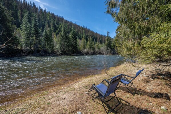 The property has 125 feet of private riverfront along the Yaak River, and the shoreline here is gentle and easily accessible – no steep cliffs or flights of stairs. You can stroll right up to the water’s edge to cast a fishing line, launch a kayak, or cool off.