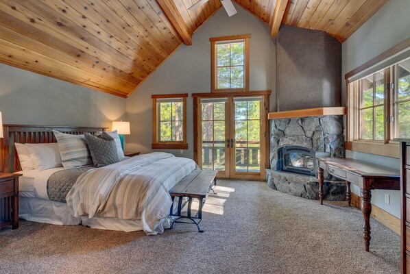 The Eagle's Nest is an upscale, professionally decorated Big Springs home with 5 bedrooms, 5 bathrooms and a private outdoor hot tub. Ideal for a gathering of friends and family, with soaring cathedral ceilings throughout, a giant wood-burning fireplace fashioned from huge granite stones, a baby grand piano, a pool table and light streaming in through abundant windows. You will be greeted by beautiful slate floors, original oil paintings, wool rugs and fine leather furniture in the common areas. Enjoy the silence and comfort of hydronic radiant heating throughout, plus high speed cable internet wi-fi. If you're visiting in the summer, you'll enjoy the central air conditioning, a very rare feature in this region. Tahoe and Alpine artwork complement the mountain style architecture.