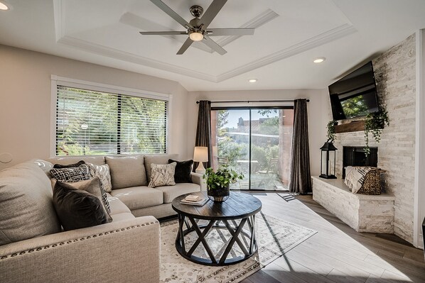La zona giorno è il nostro spazio preferito nel condominio! L'open space è luminoso e allegro. Vedrai uno spazioso e super confortevole sezionale e un televisore a schermo piatto da 55 pollici montato sulla parete del camino in pietra. Apri la porta scorrevole e porta all'esterno o goditi un caffè o un vino nel patio!