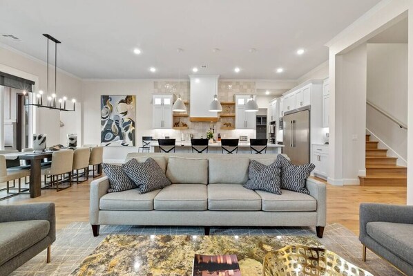 The Madison's open concept living and kitchen space are perfect for keeping everyone together in one space. The fully equipped chef's kitchen includes GE Cafe appliances, and an abundance of everything you'll need to prepare a perfect family meal. The kitchen also features a coffee, tea, and espresso bar and adult beverage station. The living room features a 65" Smart TV, gas-log fireplace, and an audio system that can be heard throughout the lower level. The dining area has a large table that seats 8 comfortably, and a leaf can be added for expanded elbow room.