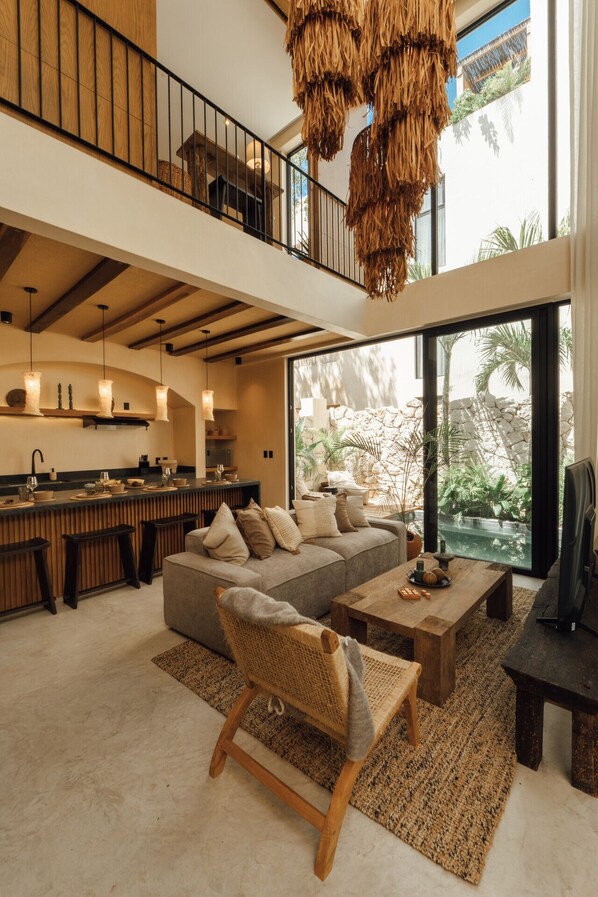 The villa’s mezzanine is more than just an additional sleeping area; it also features a dedicated desk, offering busy and successful professionals the perfect space to put in some work while staying connected to the tranquility of Tulum.