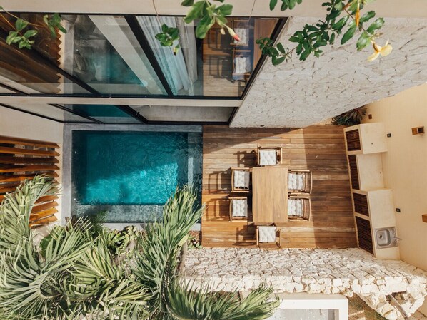 Villa 10 is a destination made for connection. Its private deck and dedicated grill area provide the ideal space for long meals and celebrations, while the rare indulgence of two private pools—one at ground level surrounded by greenery, and another on the rooftop—offers endless opportunities for relaxation under the Tulum sun and stars.