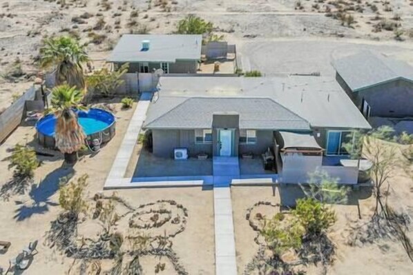Adventure awaits at our inspiring getaway retreat sitting on over 3 acres; includes 2 homes with one beautiful space connecting family, friends or small groups in one intimate location; our home has the amenities you’re looking for! You’ll delight in the expansive views of the desert sunset, picturesque mountain ranges and the unobstructed blanket of stars. Pet companions are also welcome. Our location is nestled a few short minutes from Joshua Tree National Park, 49 Palms Oasis and Downtown. *Newly Renovated & Listed* Our re-modeled ranch and chalet styled homes boasts beamed ceilings, private fenced yards and expansive views. Can comfortably sleep up to 12 guests and boasts: 4 bedrooms and 3 full bathrooms, a swimming pool, 2 hot tubs, 2 outdoor solar showers, 2 propane BBQ grills and 2 propane fire-pits! With multiple patios and common areas, there is room to spread out or come together; a wonderful place to entertain. Full access to the home, fenced yard and parking areas. We are available 24/7 to assist with guest during their stay via Airbnb, Call or texts. Semi-rural property on a private 3 acre parcel. Our location is nestled a few short minutes from Joshua Tree National Park, 49 Palms Oasis and Downtown. Car, rental car, bus, taxi, Uber/Lyft Includes 2 homes sitting on over 3 acres. Additional $30 per day for heating the hot tub; please notify us 24 hours in advance.