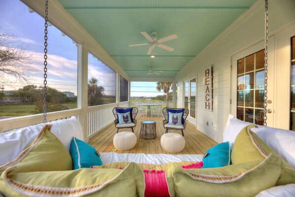 Il livello principale vanta anche un portico schermato avvolgente che offre ampie viste sulla palude, letto a dondolo gemello, amache e un tavolo da pranzo all'aperto per 8 persone.