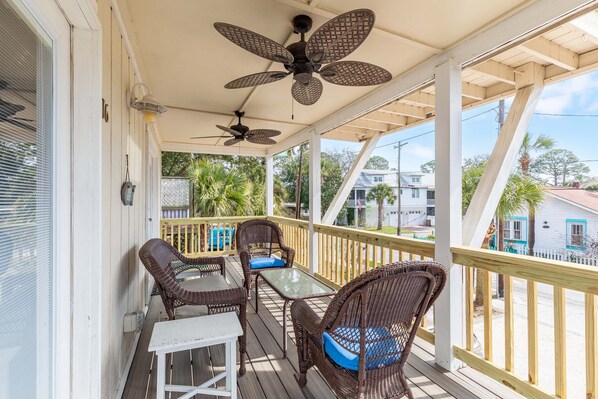 Upon arrival, guests will be welcomed by the front porch that’s located on the second story, which is perfect for enjoying the island breeze. Through the front door, there is an open living area with plenty of seating for gathering together to watch the wall-mounted, flat-screen TV. The fully equipped kitchen is just off of the living area and features stainless appliances as well as countertop seating for 3. There is a separate dining area with seating for 6 that’s perfect for coming together to enjoy a meal with your vacation group. On this level, there is also a bedroom with a queen-sized bed, a flat-screen TV, and enjoys access to an ensuite bathroom with a walk-in shower. There is an additional half-bath on the main floor