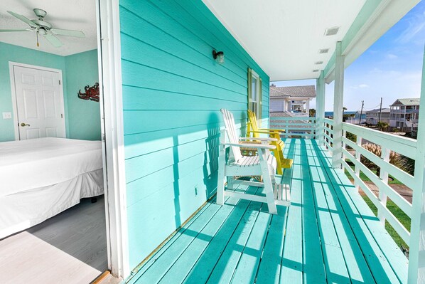 CAMERA DA LETTO 1-La zona giorno principale ha un divano letto matrimoniale e una seduta informale per intrattenere rilassati. È possibile salire sulla veranda dalla zona giorno e godere della vista sull'oceano.