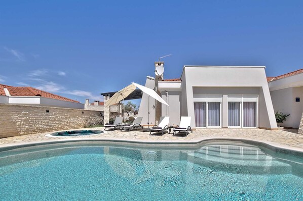 The air-conditioned house ensures comfort on hot summer days, and the spacious, fully enclosed garden offers privacy and peace – perfect for relaxing in complete comfort. The centerpiece of the garden is a large pool with RGB lighting, creating a magical ambiance for night swimming. Beside the pool is a hot tub, ideal for added relaxation. The sun terrace is furnished with loungers and umbrellas, providing shaded and sunny spots. In the garden, there is also a seating area and a dining table next to the outdoor grill, creating the perfect setting for outdoor culinary experiences.