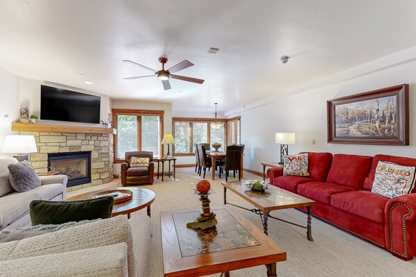 With resort amenities that include a fitness center, concierge services, ski valet, a restaurant, and local bus transportation, your family will settle right into this luxurious mountain home! Take a tour of the spacious living area featuring an attractive gas fireplace, a fully-equipped kitchen, and a large bedroom with two queen beds, a mounted flatscreen TV, and an en suite bathroom. There is even a private patio with a table and chairs to enjoy an evening meal over. You'll love the ski-in/ski-out access during the winter months, and summer visitors can hike the many nearby trails then head back to cool off with a refreshing swim in the community pool. Either way, the shared hot tub is the perfect way to relax those tired muscles after an afternoon activity, no matter what time of year!