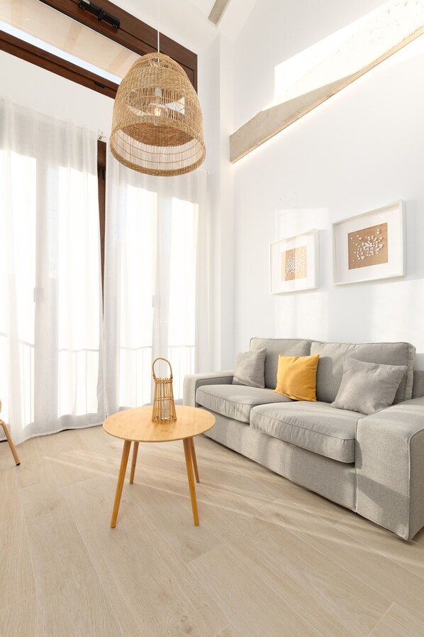 -Large living-dining room with comfortable sofa, HD-TV, 2 single folding beds of 90x190 cm, round table for 4 people, ceiling fan and air conditioning with access to balcony.
