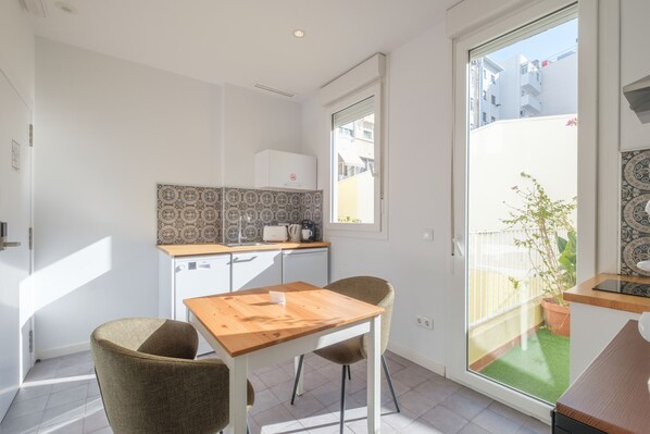 La cucina è attrezzata con frigorifero, fornello, lavastoviglie, microonde, macchina da caffè e bollitore elettrico, tutti nuovi di zecca. Insieme a un set completo di posate, bicchieri da vino, piatti, pentole e padelle. Tutto ciò che potrebbe servire per cucinare e mangiare a casa.