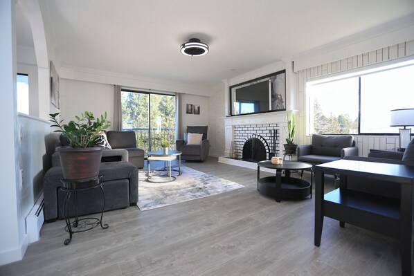 Step inside to a beautifully furnished living room, designed with modern yet cozy decor, comfortable seating, and ample natural light. Whether you’re relaxing by the fireplace or watching TV, this space is perfect for unwinding after a day of exploring the surrounding areas.