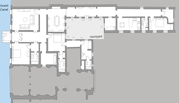 The apartment is composed of a beautiful entrance hall that opens on the terrace and on the Grand Canal, a spacious living room also with view on the Canal Grande, a luminous dining room, a fully-equipped kitchen with glass table and an internal courtyard with table and chairs. There is a spacious master bedroom that faces the Grand Canal with en-suite bathroom, a second double bedroom with en-suite bathroom that is connected through a corridor to the third smaller bedroom equipped with bunk beds and en-suite bathroom, a fourth bedroom with king size bed served by a fourth bathroom toward the back of the house, a fifth bedroom with single bed. The kitchen is spacious and well equipped with large fridge, dishwasher, 4-burner induction stoves, oven, kettle, Italian and American coffee maker and every possible electrical appliance.