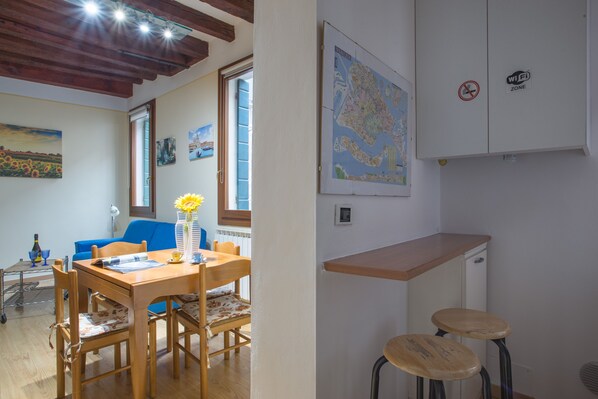 L'appartamento recentemente restaurato e accogliente si trova al primo piano (senza ascensore). L'appartamento dispone di una spaziosa camera matrimoniale con un letto king size, un soggiorno dove troverete un divano letto molto comodo adatto per due e un tavolo da pranzo, un moderno angolo cottura completamente attrezzato, tutto decorato con gusto e stile. Alla fine della giornata a piedi, puoi rilassarti godendoti un bagno caldo in inverno o facendo una doccia fresca per rinfrescarti dal mangiare delle giornate estive ... questo è ciò che offre il bagno. L'appartamento è dotato di riscaldamento autonomo, aria condizionata, connessione Internet wifi, TV satellitare, asciugacapelli, lavastoviglie, lavatrice, ferro da stiro, asse da stiro, bollitore, tostapane, macchina da caffè italiana e americana, culla, vasca da bagno. L'area in cui si trova l'appartamento è una zona molto veneziana servita da negozi, caffè, ristoranti e cichetterie locali dove si può godere di una vasta scelta di deliziosi piatti veneziani insieme al sapore del tipico aperitivo che si chiama spritz servito con una varietà di stuzzichini meravigliosi.