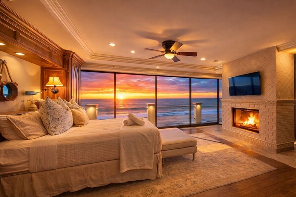 Upstairs, the primary suite is a true oceanfront sanctuary. The bedroom features a full wall of windows that look directly over the Pacific, allowing you to wake up to the sight and sound of the ocean each morning. The spa-inspired primary bathroom includes a soaking tub, an open walk-in shower, and a beautifully designed layout that creates a relaxing, resort-like experience.