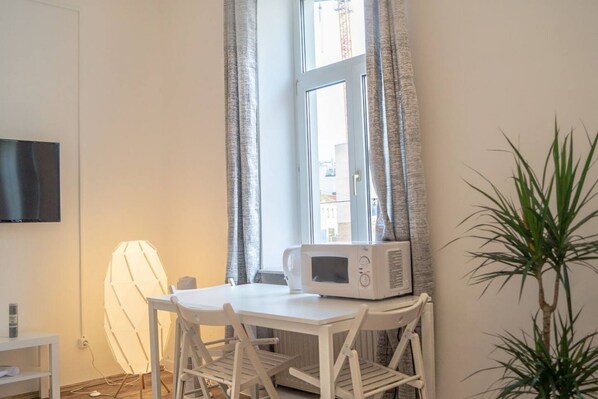 Another inviting private studio, measuring 18 square meters, is ideal for 2 guests and offers a double bed (140 x 200 cm), a wardrobe, dining table for two, smart TV, kitchenette, and private bathroom, perfect for a peaceful urban escape.