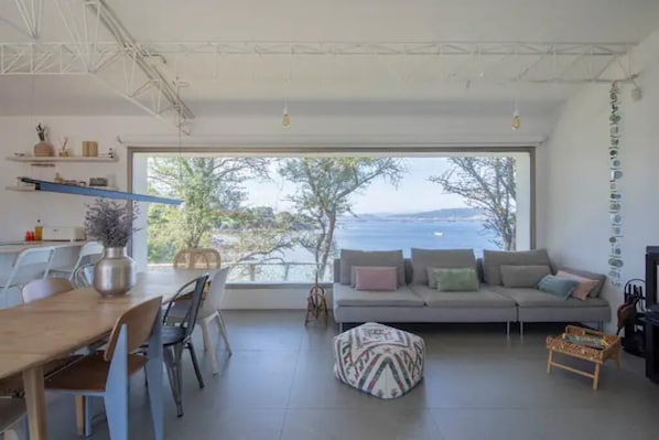A peaceful beachside retreat, modern and cosy. The house is embedded between the sands of blue flagged Area Brava and a secluded cove. Anchored on the very shore of the bay of Aldán, our home is a trove of light, sand and murmuring waves to forge luminous family memories and bonds to last for a lifetime. Equally well-suited to action –paddle surf, kayaking, biking— and relaxation –smart projector, fireplace—, let the song of the Atlantic Ocean and our hospitality lull you into a delightful stay. The space A bit of history From the very moment we spotted the austere bearing of the original construction –a remnant of an old fish farm—, we became aware of the uniqueness of its location and its dazzling possibilities. The building evoked the melancholy of a stranded whale, or that of a boat wrecked against the rocks, and bore the mark of long-lasting oblivion. Today, it is a modern space, comfortable, vibrant with light and family life: a home we feel lucky to live in and proud to show.