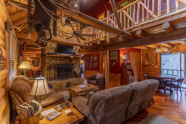 Il livello principale ha una grande sala con soffitti a volta con travi a vista e mobili in pelle scamosciata disposti intorno a un camino in pietra con un lettore TV e BluRay montato in testa. Canne da mosca vintage decorano la stanza, e c'è un rustico albero di Natale in un angolo decorato con un tema di pesca a mosca. Un tavolo rotondo per quattro porte scorrevoli in vetro si affaccia sul fiume, e c'è un altro tavolo per 6 nella sala da pranzo. La sala da pranzo ha il suo camino a legna ed è accanto alla spaziosa cucina con pavimenti in pietra. C'è anche un mezzo bagno con lavatrice e asciugatrice a questo livello.