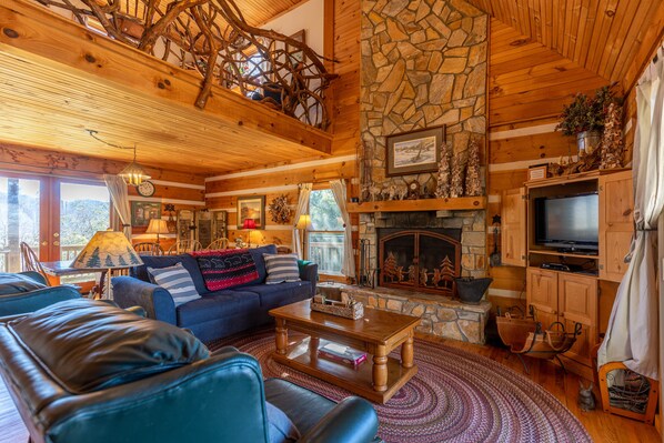 Enjoy the open floor plan of this cabin while you relax during your mountain retreat. The unforgettable twig style banister and railing on the staircase and loft will definitely make a lasting impression, and the long range mountain view will take your breath away.