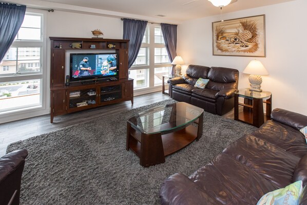 Inside, the living area features a large TV conveniently positioned for optimal viewing from the kitchen, dining area, and comfortable leather sofas. Enjoy complimentary WiFi, premium cable, and a Blu-ray/DVD player for your entertainment. For added fun, a pool/air hockey table is located between the dining and living areas.