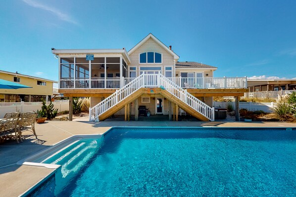 The oceanfront location is ideal with access to the beach directly from your private pool. There is a nice shady area underneath the upper-level deck by the pool to enjoy the pool area without being in direct sunlight, great for smaller children. The hot tub is a wonderful way to enjoy the ultimate in relaxation. A screened porch adds to the many extra amenities offered. Amenities include TVs, free WiFi, a DVD player, a gas grill, a hot tub, a pool, a screened porch, and an outside shower.