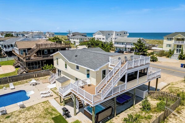 Extras: 2026 Beach Gear Credit, Private Pool (32x14), Hot Tub (8), Wireless Internet Access, Ping Pong Table, Foosball, Outdoor Shower, No Smoking, Dogs Allowed, Parking: 7 Cars, Max. Occupancy 17 people, Distance to the Beach: 200 ft.
