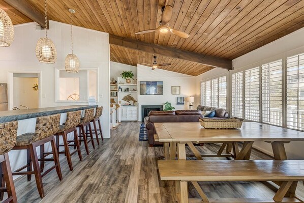 Top-Level: Living Room with Smart TV and Fireplace (Electric); Sunroom; Dining Room with Built-In Table (seats 8); Kitchen with Bar (seats 5), Blender, Coffee Maker (Drip), Dishwasher, Microwave, Oven/Stove, Refrigerator, Toaster, Pots, Pans, Dishes, Cooking Essentials, and Additional Table (seats 8); Screened Porch; King Master Bedroom with TV and Attached Full Bathroom; King Bedroom with Smart TV; Queen Bedroom with Smart TV, and Access to Hall Full Bathroom; Bedroom with 2 Bunk Beds; Hall Full Bathroom.