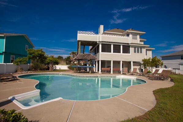 Extra amenities to enjoy include central air-conditioning, four Roku-equipped TVs for streaming your favorite channels (no cable), an outdoor shower, ceiling fans, complimentary internet access, a screened porch, and brand-new multi-level open decks. The magnificently designed in-ground swimming pool features a spacious deck for lounging, a Hawaiian-themed tropical bar for entertaining, and two private docks for fishing, crabbing, or launching kayaks, paddleboards, and canoes.