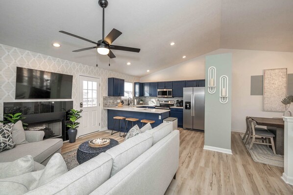 The home’s bright and fresh interior is adorned with contemporary furnishings set against modern décor, creating spaces as suitable for relaxation as they are entertaining. Kick up your feet on the plush living room sofa as you stream a movie or episodes of your favorite shows on the mounted smart TV. The centerpiece kitchen showcases stainless steel appliances, glossy stone counters, and striking deep blue cabinetry stocked with all the conveniences of home. Gather for meals together at the sophisticated dining room table with seating for 10 or enjoy meals at the go perched up at the counter with high-top stool seating for 3. Pool sharks and beginners alike will want to make their way to the garage-turned-game room, where a pool table awaits to host hours of competitive fun.