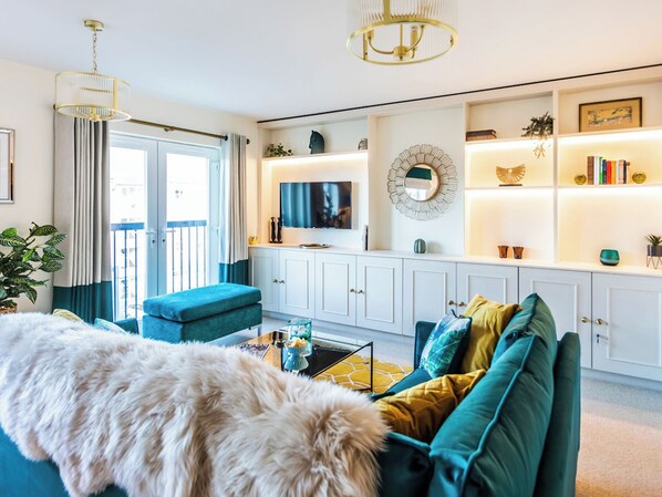 Living room: With Smart TV and French doors leading to Juliette balcony.