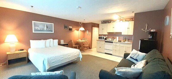 This studio unit has a queen bed and a pull-out sleeper sofa. Unit comes equipped with kitchenette, including apartment sized refrigerator and stove/oven. Color Cable TV and DVD. Shower stall in bath. This unit has a private balcony. Air Conditioned.