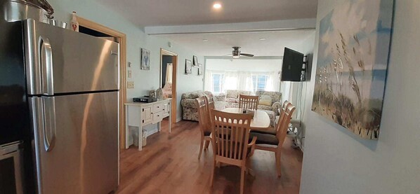 This 2-bedroom cottage has 1 queen bed in the first bedroom and 2 twin beds in the second bedroom. There is a sofa in the living area for an optional 5th person (Not a pullout). Unit comes equipped with a full kitchen, including refrigerator, stove/oven, microwave, and dishwasher. Color Cable TV. Full shower in bath. Air Conditioned.