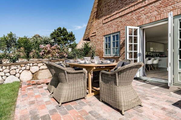 Sulla grande trama esposta a sud-ovest, sotto casa sono state costruite 2 case a schiera con un carattere unico. La casa qui proposta ha una superficie abitabile / utilizzabile di circa 200 m². Al piano terra troverete una cucina abitabile spaziosa e di alta qualità che si collega alla spaziosa sala da pranzo. In cucina otterrai una macchina per il caffè da Kitchenaid. trova un bollitore e una macchina da caffè Nespresso. C'è una stufa in maiolica Mylin nella luminosa zona giorno. Inoltre, a questo livello sono disponibili un bagno per gli ospiti e un ampio ingresso con guardaroba. Al piano superiore c'è una camera da letto matrimoniale con bagno en suite. Il bagno ha una vasca da bagno oltre alla doccia. A questo livello sono disponibili anche un'altra camera da letto con letto matrimoniale e un altro bagno con doccia e servizi igienici. Il clou della camera da letto è il soffitto a travi aperte con illuminazione integrata. Nel seminterrato ci sono altre due camere da letto e un bagno privato. Accanto ad essa è l'area benessere, che contiene anche una doccia / WC. Segue un ripostiglio con lavatrice, asciugatrice e asse da stiro con ferro da stiro. Tutte le stanze nel seminterrato hanno grandi finestre a traliccio dal pavimento al soffitto. Tutti i piani sono dotati di riscaldamento a pavimento e nei bagni sono disponibili anche radiatori scaldasalviette. Piastrelle in calcare di alta qualità, pavimenti in legno con assi e accessori per carpenteria completano l'arredamento di lusso. Oltre al grande schermo piatto nella zona giorno, tutte le camere hanno anche una TV a schermo piatto.